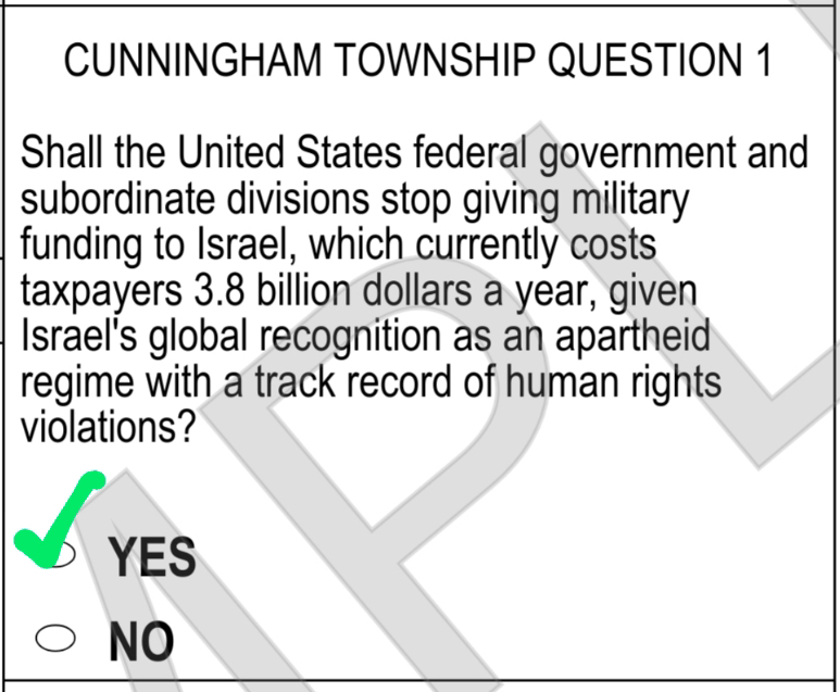 “Shall the United States Federal Government and subordinate divisions stop giving military funding to Israel, which currently costs taxpayers 3.8 billion dollars a year, given Israel’s global recognition as an apartheid regime with a track record of human rights violations?”